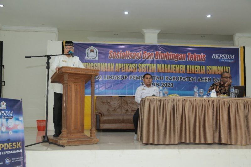 MEULABOH – Penjabat (Pj) Bupati Aceh Barat diwakili Asisten Administrasi Umum Setdakab Aceh Barat, Nyak Na, SE, M.Ec Dev., membuka kegiatan sosialisasi dan bimbingan teknis Aplikasi Sistem Manajemen Kinerja (Simanja) dilingkungan Pemerintah Kabupaten Aceh Barat yang dilaksanakan di aula gedung C Komplek Dinas Pendidikan dan Kebudayaan Aceh Barat, Rabu (25-01-2023).