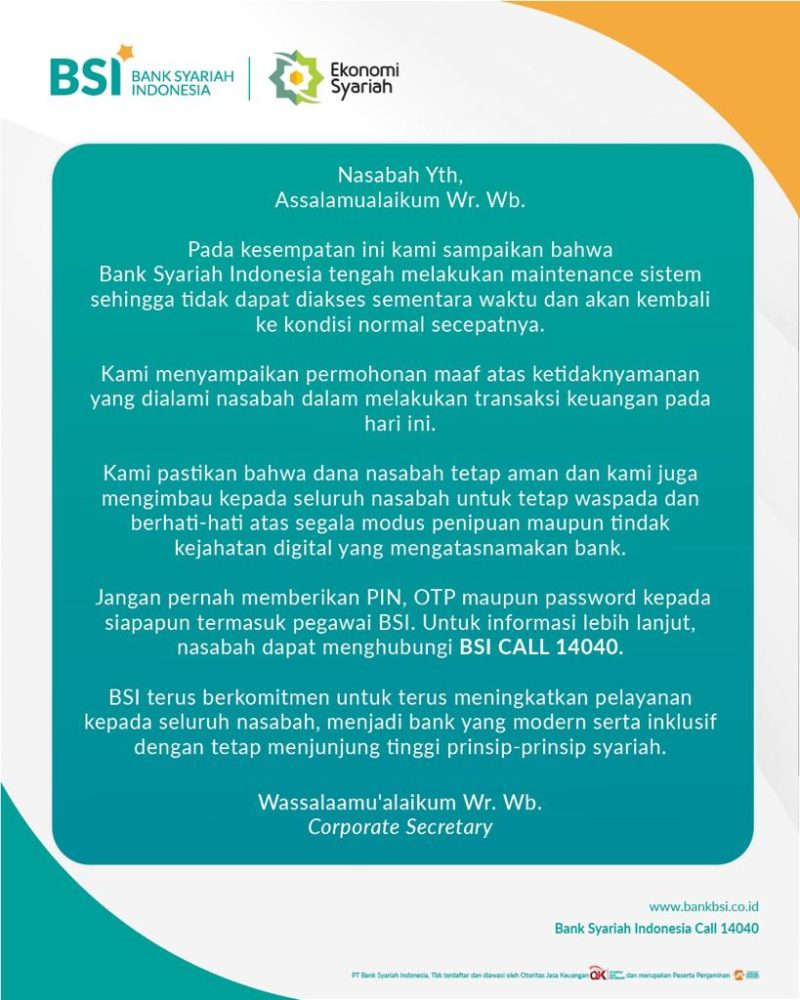 Gunawan juga menyampaikan terima kasih kepada nasabah yang telah setia menggunakan layanan BSI, serta memohon maaf atas kendala dan ketidaknyamanan yang dialami sehubungan dengan berlangsungnya proses maintenance sistem di BSI.