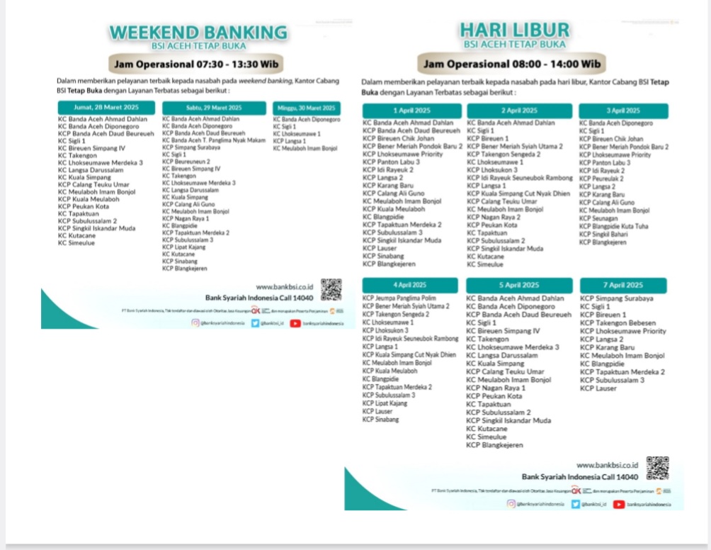 Banda Aceh – Bank Syariah Indonesia (BSI) Aceh tetap beroperasi secara terbatas selama hari raya Idul Fitri 1446 H dan libur lebaran yang dimulai tanggal 28 Maret – 07 April 2025.