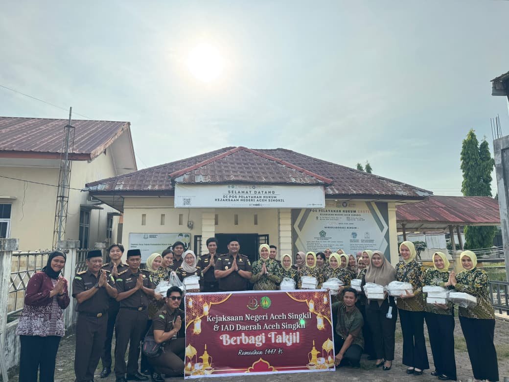Dalam kegiatan tersebut, Kejaksaan Negeri Aceh Singkil membagikan sebanyak 200 paket takjil kepada masyarakat yang melintas di depan Pos Pelayanan Hukum Gratis Kejaksaan Negeri Aceh Singkil sebagai bentuk kepedulian dan kebersamaan dengan masyarakat yang sedang menjalankan ibadah puasa.