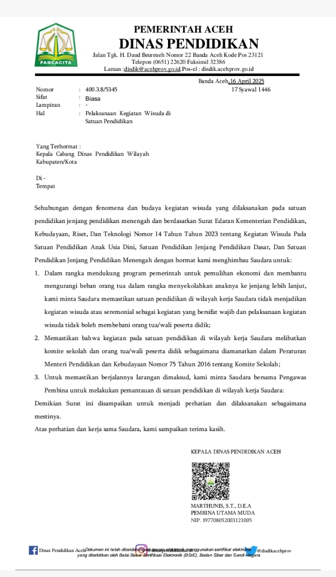 Imbauan tersebut tertuang dalam surat bernomor 400.3.8/5345 tertanggal 16 April 2025, yang ditandatangani langsung oleh Kepala Dinas Pendidikan Aceh, Marthunis, ST., D.E.A. Dalam surat tersebut, Marthunis menekankan bahwa pelaksanaan wisuda tidak boleh membebani wali murid, baik secara finansial maupun moral.