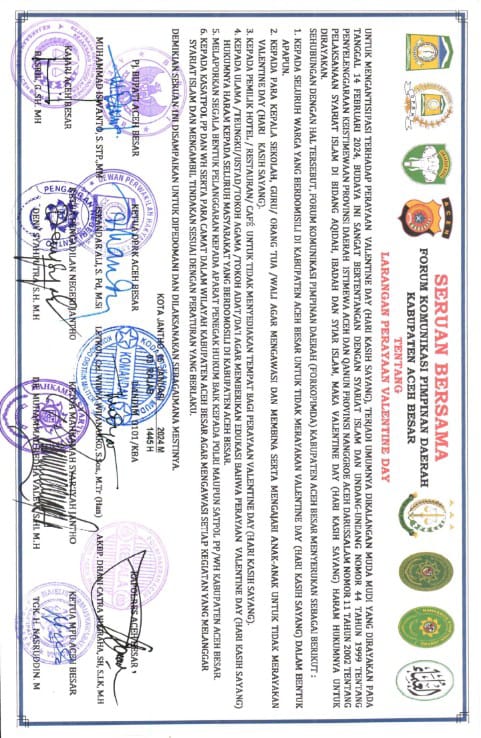 Penegasan itu terungkap melalui seruan bersama yang ditandatangani oleh jajaran Forkopimda Plus Aceh Besar tertanggal 15 Januari 2024 M atau 3 Rajab 1445 H. Seruan bersama itu untuk mengantisipasi terjadinya perayaan Valentine Day dan sudah dilakukan pada tahun sebelumnya, sebagai upaya penegakan syariat Islam di Aceh.