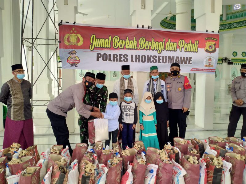 NOA | Lhokseumawe – Polres Lhokseumawe menyantuni 50 anak yatim piatu dalam program Jumat Berkah Berbagi dan Peduli Polres Lhokseumawe di Masjid Al Munawarah Desa Blang Pulo, Kecamatan Muara Satu, Kota Lhokseumawe, Jumat (5/11/2021).
