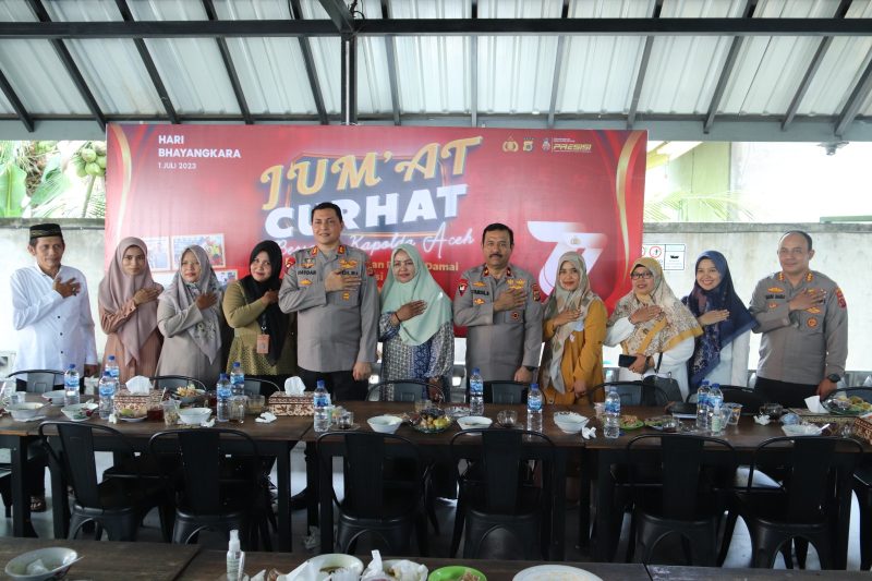 Banda Aceh – Kapolda Aceh Irjen Ahmad Haydar bersama Wakapolda Brigjen Syamsul Bahri beserta sejumlah pejabat utama (PJU) mengisi Jumat Curhat dalam rangka Hari Bhayangkara di Solong Jepang, Kecamatan Ulee Kareng, Kota Banda Aceh, Jumat, 16 Juni 2023.
