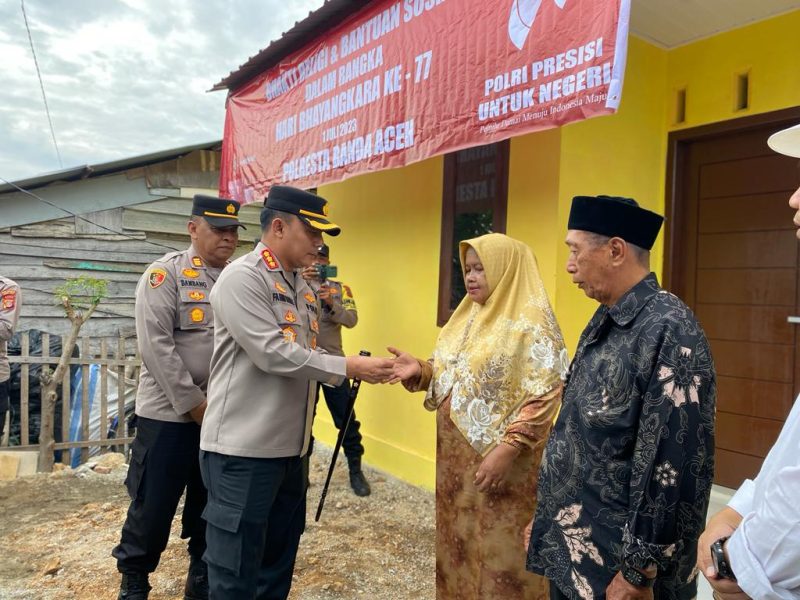 Banda Aceh – Kapolresta Banda Aceh, Kombes Pol Fahmi Irwan Ramli, SH, SIK, M.Si didampingi Kabid Perkim Provinsi Aceh. Ir. Agus Salim, ST, MT menyerahkan kunci rumah kepada warga kurang mampu di gampong Jawa, Kuta Raja, Banda Aceh dalam program bedah rumah, Jumat (14/7/2023) pagi.