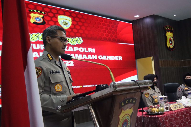 NOA | Banda Aceh – Karo SDM Polda Aceh Kombes Pol. Fajar Budiyanto, S. I. K., M. H, membuka kegiatan sosialisasi Peraturan Kapolri (Perkap) tentang pengarusutaman gender tahun anggaran 2022 yang digelar di Aula Presisi, Mapolda Aceh, Selasa (31/5/22).