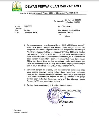 Ketua DPRA Zulfadhli dalam surat balasannya menyatakan tidak bisa menghadiri rapat yang sangat penting bagi Rakyat itu.