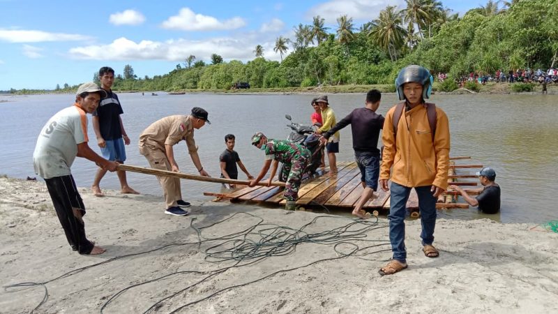 NOA| Simeulue – Batituud Koramil 04/Salang Kodim 0115/Simeulue Serma M.Toha membantu warga menyeberang sungai menggunakan rakit sebagai alternatif penyebrangan dikarenakan tergerusnya jembatan di Desa Lala Bahagia Kecamatan Salang, Selasa (11/01/2022).