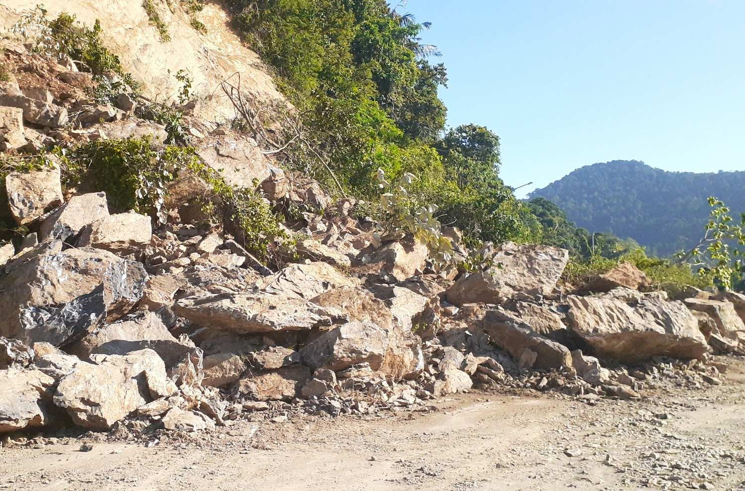 Material batu gunung yang longsor di Dusun Lhokseudu KM 30 Desa Layeun Kecamatan Leupung Kabupaten Aceh Besar, Sabtu (29/11/2025). (Foto : NOA.co.id/Farid Ismullah/Red)