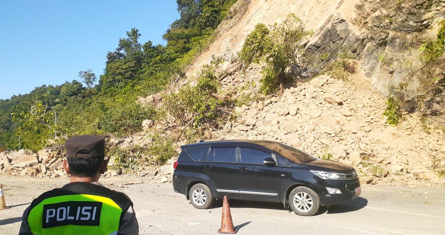 Petugas Kepolisian saat membantu kelancaran lalu lintas di Dusun Lhokseudu KM 30 Desa Layeun Kecamatan Leupung Kabupaten Aceh Besar, Sabtu (29/11/2025). Longsor mengakibatkan kemacetan arah banda aceh menuju barat selatan. (Foto : Farid Ismullah/NOA.co.id/Red).