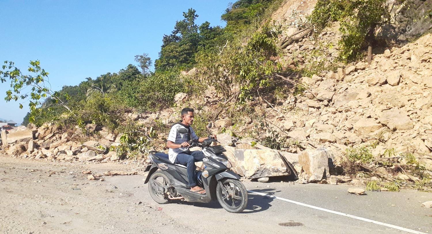 Pengendara saat melintasi Material batu gunung yang longsor di Dusun Lhokseudu KM 30 Desa Layeun Kecamatan Leupung Kabupaten Aceh Besar, Sabtu (29/11/2025). Pusdalops BPBD Aceh Besar menyebutkan Pihaknya terkendala komunikasi akibat tidak ada jaringan internet di Lhokseudu. (Foto : NOA.co.id/Farid Ismullah/NOA.co.id/Red).