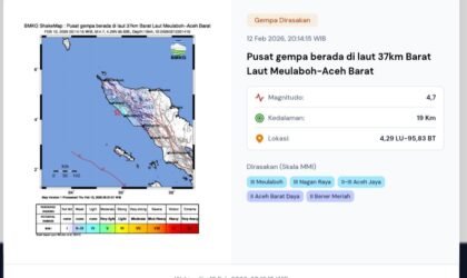 Aceh Jaya – Gempa bumi bermagnitudo 4,7 yang berpusat di laut, 37 kilometer barat laut Meulaboh,…