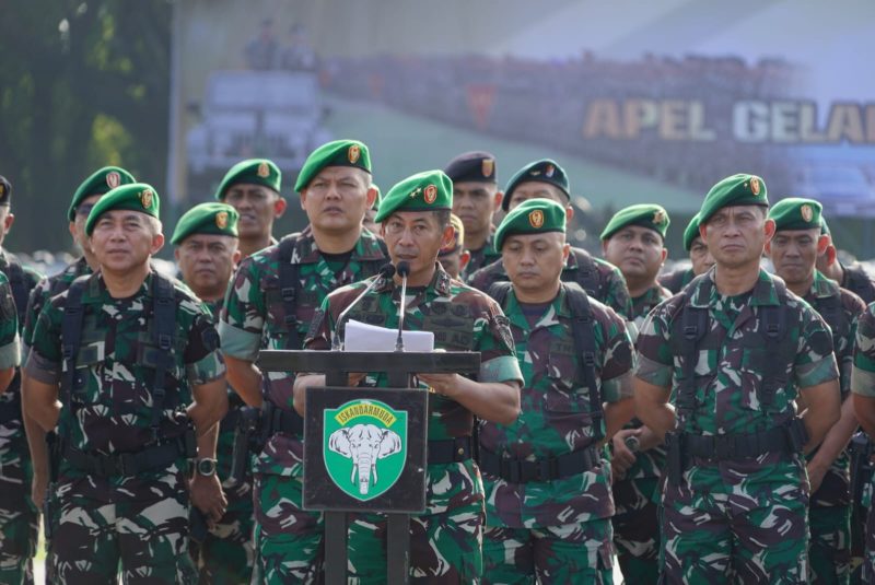 Banda Aceh – Panglima Komando Daerah Militer Iskandar Muda (Pangdam IM) Mayor Jenderal TNI Novi Helmy Prasetya, S.I.P, M.I.P., memimpin apel gelar pasukan secara serentak dalam rangka kesiapan TNI pada Pam Pemilu 2024, secara virtual dengan Panglima TNI Jenderal TNI Agus Subiyanto, di Lapangan Blang Padang Kota Banda Aceh, Kamis (01/02/24) Pagi.