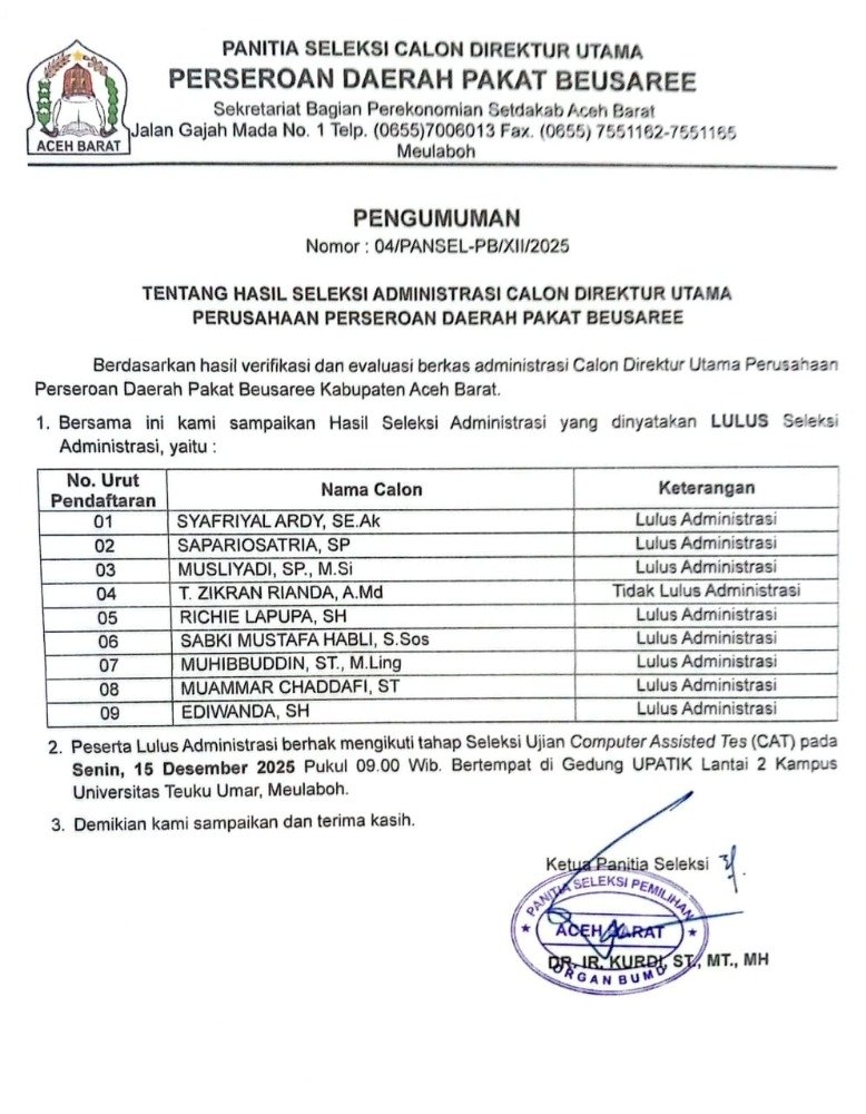 Sementara itu, delapan kandidat yang dinyatakan lolos seleksi administrasi berhak melanjutkan ke tahapan berikutnya, yakni Computer Assisted Test (CAT). Tahap ini dijadwalkan akan dilaksanakan pada Senin, 15 Desember 2025, bertempat di Gedung Upatik Lantai II, Kampus Universitas Teuku Umar (UTU) Meulaboh.