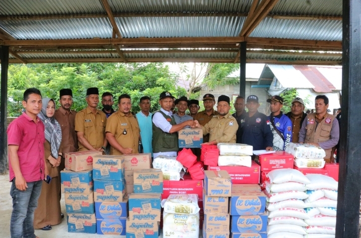 Pendistribusian bantuan kepada korban banjir di Kecamatan Woyla Barat ini diserahkan kepada Camat Woyla Barat Irwan, SE, disaksikan oleh para kepala desa dalam kecamatan Woyla Barat serta masyarakat sekitar.