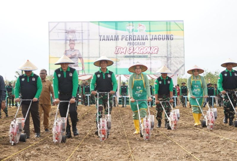 Aceh – Panglima Komando Daerah Militer Iskandar Muda (Pangdam IM), Mayor Jenderal TNI Novi Helmy Prasetya, S.I.P, M.I.P., didampingi Ketua Persit KCK Daerah IM Ny. Iin Novi Helmy Prasetya beserta Forkopimda Aceh melaksanakan Tanam Perdana Program I’M Jagong secara serentak di tiga wilayah Provinsi Aceh pada Selasa (23/05/23) pagi.
