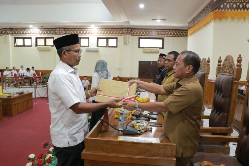 NOA I Aceh Barat – Pemerintah Kabupaten Aceh Barat menyerahkan secara simbolis buku rancangan qanun tentang laporan pertanggungjawaban pelaksanaan Anggaran Pendapatan Belanja Kabupaten (APBK) Aceh Barat tahun anggaran 2021 kepada Dewan Perwakilan Rakyat Kabupaten (DPRK) Aceh Barat.