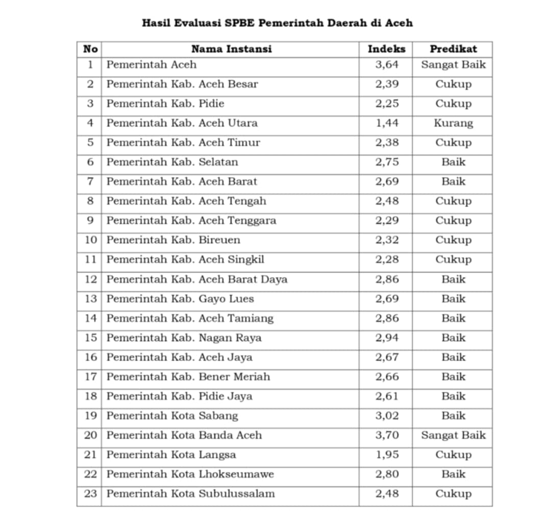 Banda Aceh – Pemerintah Kota Banda Aceh kembali mencatatkan prestasi membanggakan dengan meraih predikat “Sangat Baik” dalam Evaluasi Sistem Pemerintahan Berbasis Elektronik (SPBE) Tahun 2024. Evaluasi ini dilakukan oleh Kementerian Pendayagunaan Aparatur Negara dan Reformasi Birokrasi (PANRB) sebagai upaya untuk meningkatkan efisiensi, transparansi, dan akuntabilitas tata kelola pemerintahan. Dengan indeks 3,70, Banda Aceh menempatkan diri sebagai pemerintah daerah dengan nilai tertinggi di Provinsi Aceh sekaligus menjadi contoh bagi daerah lain dalam transformasi digital.