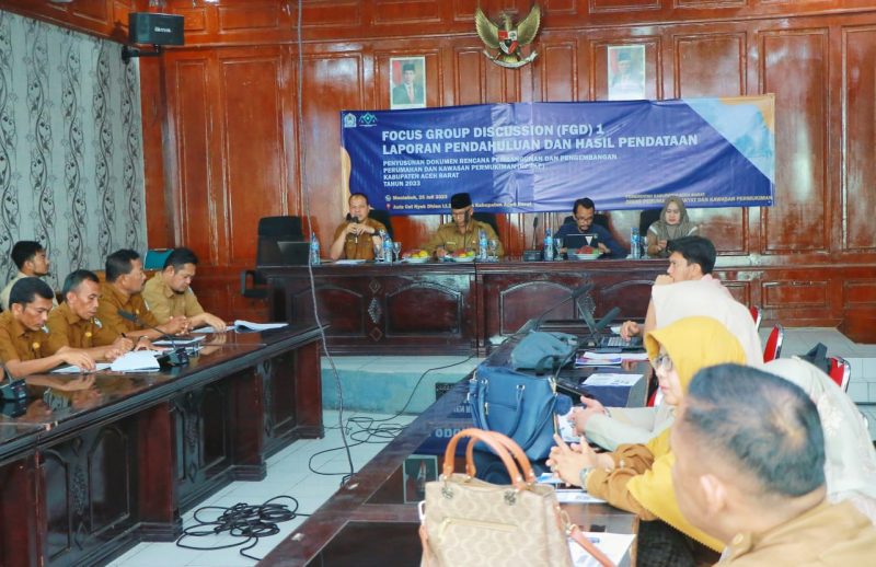 Meulaboh – Pemerintah Kabupaten Aceh Barat melalui Dinas Perumahan Rakyat dan Kawasan Permukiman (Perkim) melaksanakan Focus Group Discussion (FGD) perdana terkait penyusunan dokumen Rencana Pembangunan, Pengembangan Perumahan dan Kawasan Permukiman (RP3KP) Kabupaten Aceh Barat tahun 2023, Selasa (25-07-2023).