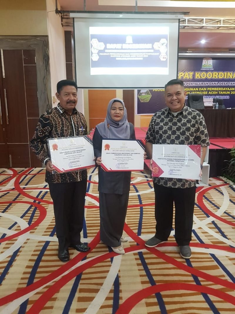 NOA | Aceh Selatan – Pemerintah Kabupaten Aceh Selatan menerima piagam sebagai Kabupaten tercepat tuntas penyaluran Dana Desa Tahun Anggaran 2021 dan sebagai Kabupaten tercepat penyaluran Dana Desa Tahap I Tahun Anggaran 2022 oleh Gubernur Aceh melalui Kepala Dinas Pemberdayaan Masyarakat dan Gampong (DPMG) Aceh, Dr. Ir. ZULKIFLI, M.Si kepada Bupati Aceh Selatan, Tgk.Amran, yang diterima langsung oleh Kepala Dinas DPMG Kabupaten Aceh Selatan, Hj. Agustinus. SH, Di Hotel Grand Permata Hati Banda Aceh, Selasa (28/06).