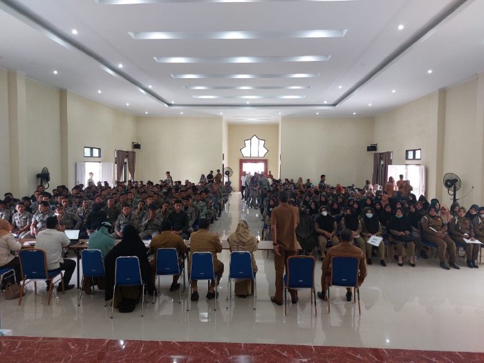 NOA | Kota Jantho – Ratusan pegawai honorer Pemerintahan Aceh Besar terutama di jajaran Setdakab dan Satpol PP dan WH Aceh Besar mengikuti cek kesehatan (tes urine) dan sosialisasi kesehatan jiwa serta bahaya narkoba di Aula SKB Kota Jantho, Selasa (18/10/2022).