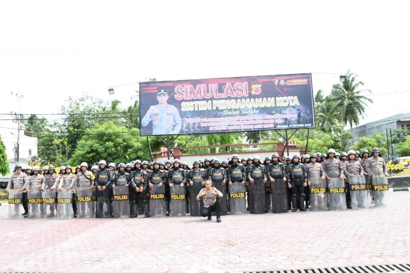 Aceh timur – Menghadapi Pemilihan Umum tahun 2024 Kapolres Aceh Timur AKBP Andy Rahmansyah, S.I.K.S.H.,M.H, memimpin apel simulasi Sistem Pengamanan Kota (Sispam Kota) dalam rangka Operasi Mantap Brata 2023-2024 di Wilayah Hukum Polres Aceh Timur di Lapangan Apel Sarja Arya Racana, Sabtu (14/10/2023) pagi.