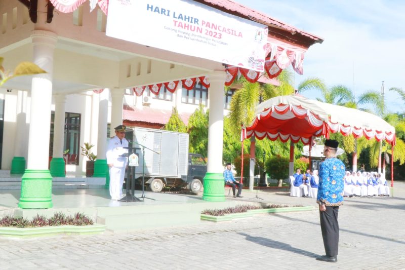 Meulaboh – Penjabat (Pj) Bupati Aceh Barat, Drs. Mahdi Efendi, bertindak sebagai Inspektur Upacara (Irup) pada peringatan Hari Lahir Pancasila tahun 2023 bertajuk “Gotong Royong Membangun Peradaban dan Pertumbuhan Global” yang dilaksanakan di halaman Kantor Bupati Aceh Barat, Kamis (01-06-2023).