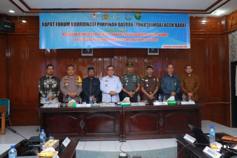MEULABOH – Penjabat (Pj) Bupati Aceh Barat, Drs. Mahdi, memimpin rapat Forum Koordinasi Pimpinan Daerah (Forkopimda) Aceh Barat dalam rangka persiapan pelaksanaan Pemilu dan Pilkada tahun 2024 di Kabupaten Aceh Barat serta antisipasi perayaan malam pergantian tahun baru 2023, yang dilaksanakan di aula Cut nyak dhien Bappeda Aceh Barat, Rabu (28-12-2022).