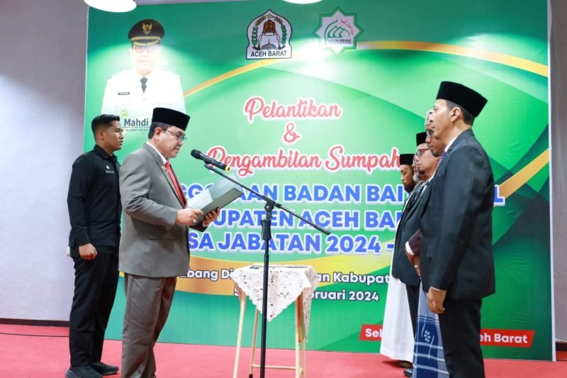 Meulaboh – Penjabat (Pj) Bupati Aceh Barat Drs. Mahdi Efendi melantik Komisioner Badan Baitul Mal Kabupaten (BMK) Aceh Barat untuk periode tahun 2024-2029. Acara tersebut berlangsung di Aula Cabdin Pendidikan Wilayah Aceh Barat dan dihadiri oleh para unsur forkopimda, para Kepala SKPK, Senin, (26/02/2024).