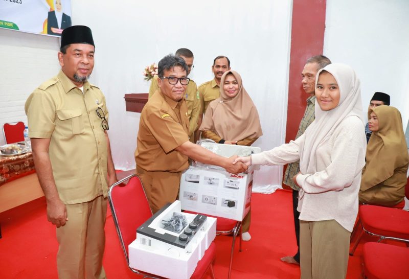 Sigli – Upaya meningkatkan keterampilan dalam mengembangkan usaha bagi UMKM terdampak Covid-19, Dinas Perdagangan Koperasi dan Usaha Kecil Menengah (Perdagkop UKM) Pidie menggelar pelatihan menjahit sekaligus penyerahan peralatan menjahit bagi Pelaku UMKM.