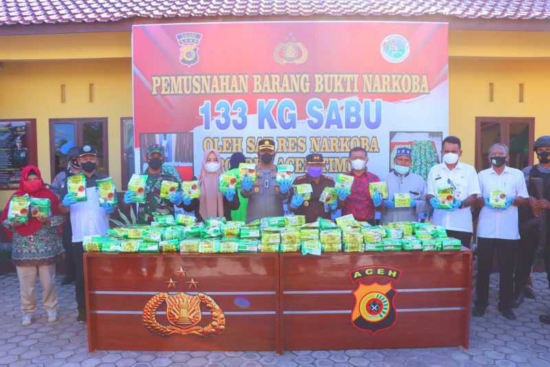 NOA | Banda Aceh – Polda Aceh melalui Ditresnarkoba menggelar pemusnahan barang bukti narkotika berupa 100 kg sabu dan 445 kg ganja di lapangan belakang, Mapolda Aceh, Rabu (15/12/21) pagi.