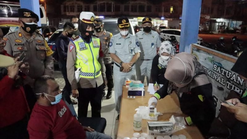 NOA | Lhokseumawe – Personel Polres Lhokseumawe bersama tim gabungan melakukan pemeriksaan urin terhadap pengemudi angkutan umum di terminal tipe A Mon Geudong, Banda Sakti, Kota Lhokseumawe, Sabtu (25/12/2021) malam.