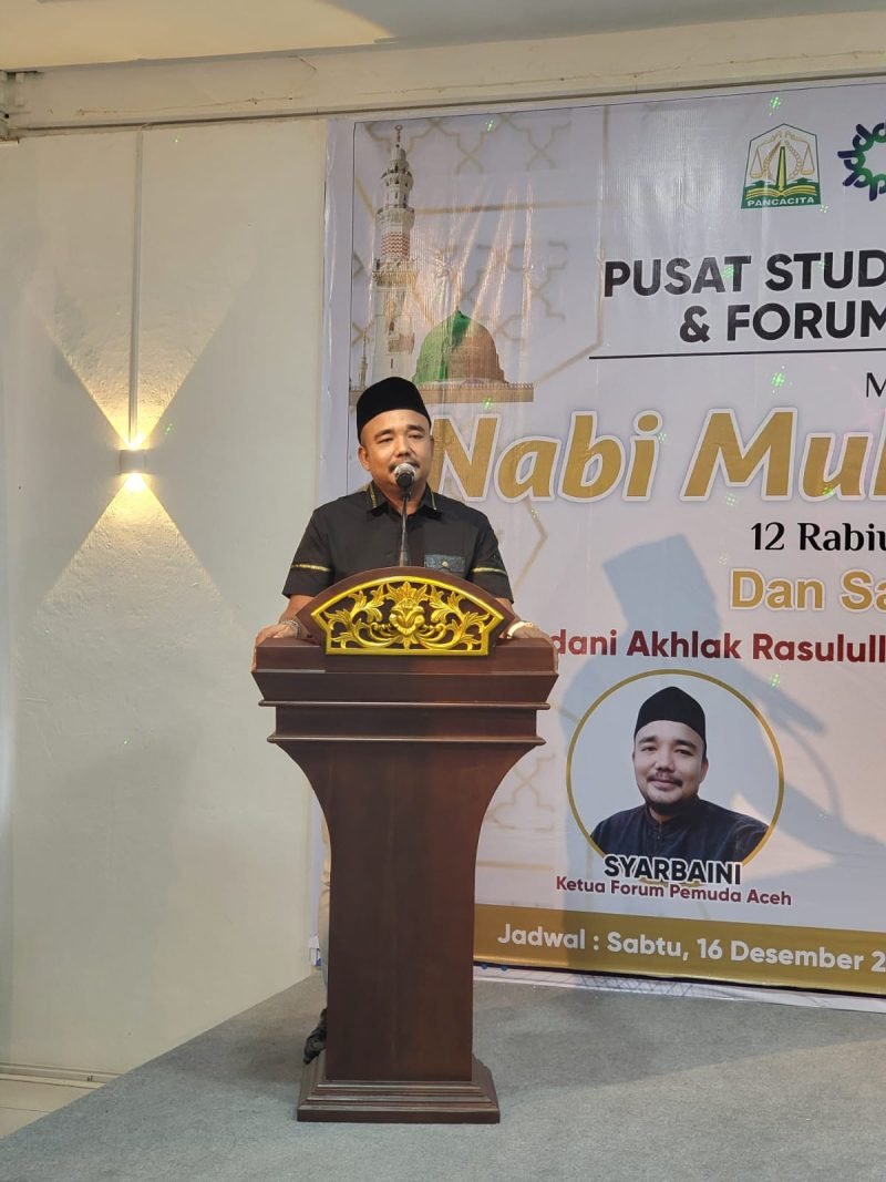 Banda Aceh – Pusat Studi Pemuda Aceh (PUSDA) dan Forum Pemuda Aceh (FPA) melaksanakan Maulid Nabi Muhammad SAW 1445 H dan Santunan Anak Yatim, di Aula Tekkomdik, Banda Aceh, Sabtu, 16 Desember 2023.