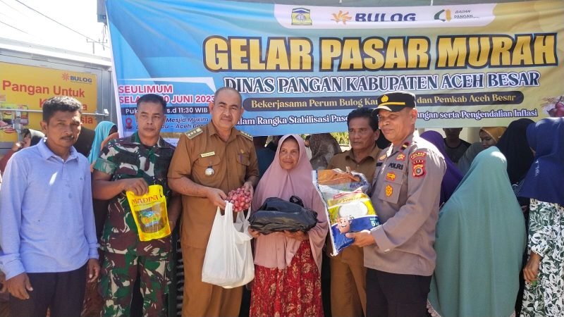 Kota Jantho – Berkomitmen untuk membantu meringankan beban masyarakat khususnya menjelang Hari Raya Idul Adha, sekaligus menekan angka inflasi, Pemerintah Kabupaten (Pemkab) Aceh Besar, menggelar pasar murah, di halaman Masjid Jami’ Al-Hidayah Kemukiman Lamkabeu, Kecamatan Seulimuem, Aceh Besar, Selasa (20/06/2023) pagi.