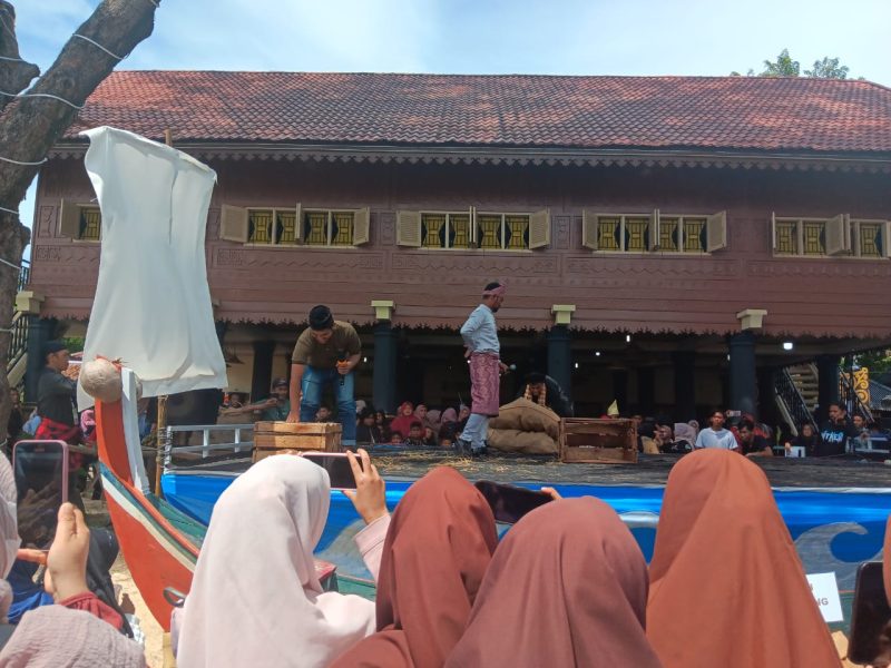 Banda Aceh – Sanggar seni Ikatan Pemuda Pelajar dan Mahasiswa Kuta Cot Glie (IPPERMATA) Jaya yang menampilkan atraksi teaterikal Amad Rahmanyang yang merupakan cerita rakyat pemuda yang durhaka dengan ibunya menghipnotis paengunjung Pekan Kebudayaan Aceh (PKA) 8 hadir di anjungan Aceh Besar, di Komplek Taman Ratu Safiatuddin, Banda Aceh, Sabtu (11/11/2023).