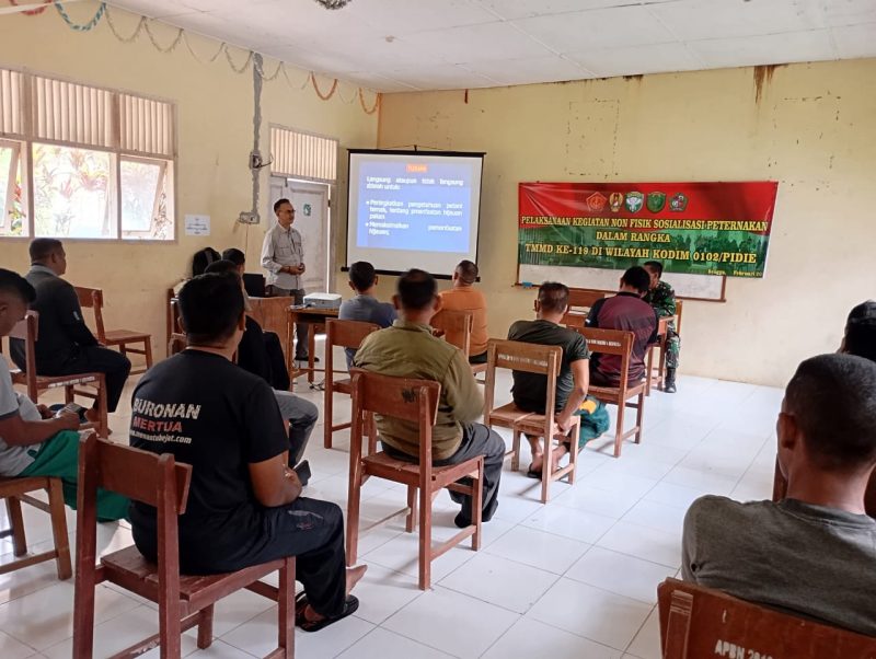 Pidie – Dalam upaya meningkatkan pemahaman dan keterampilan masyarakat di sektor pertanian dan peternakan,sebagai sasaran Nonfisik Satgas TMMD Reguler Ke-119 Kodim 0102/Pidie bekerja sama dengan Dinas Pertanian/Peternakan Kabupaten Pidie mengadakan Sosialisasi Penyuluhan Pertanian dan Peternakan di Gampong Beungga, Kecamatan Tangse, Kabupaten Pidie, pada Sabtu (02/03/2024).