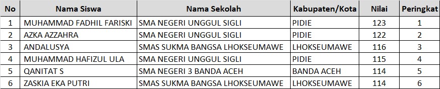 Secara perseorangan, nilai tertinggi dari simulasi ini diraih oleh Muhammad Fadhil Fariski dari SMA Negeri Unggul Pidie yang meraih nilai 123 dari nilai maksimal 205. Dinas Pendidikan Aceh memberikan penghargaan bagi 6 (enam) siswa yang mencapai nilai tertinggi sebagai apresiasi dan penyemangat untuk serius mempersiapkan diri. Keenam siswa tersebut berasal dari SMA Negeri Unggul Pidie, SMAS Sukma Bangsa Lhokseumawe dan SMA Negeri 3 Banda Aceh.