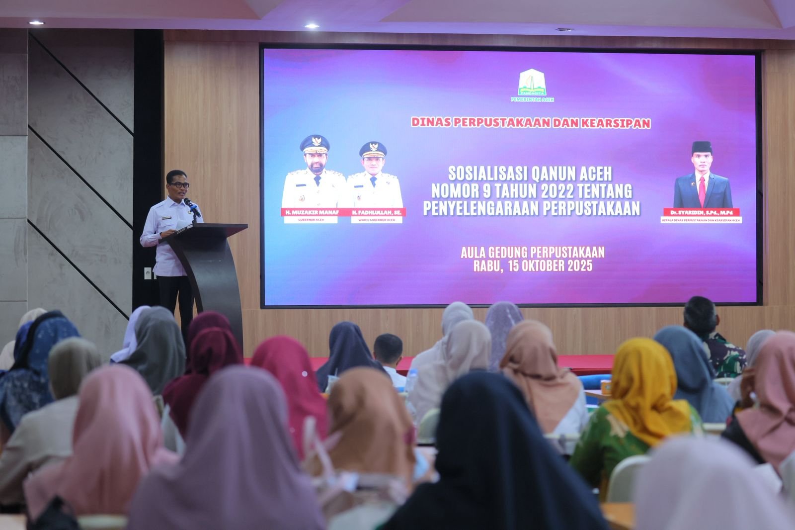 Banda Aceh – Dinas Perpustakaan dan Kearsipan Aceh (DPKA) menggelar kegiatan Sosialisasi Qanun Penyelenggaraan Perpustakaan Tahun 2025 di Aula DPKA, Lamnyong, Banda Aceh, Rabu, 15/10. Kegiatan itu bertujuan meningkatkan pemahaman para pustakawan dan pengelola perpustakaan terhadap regulasi baru yang menjadi landasan hukum penyelenggaraan perpustakaan di Aceh.