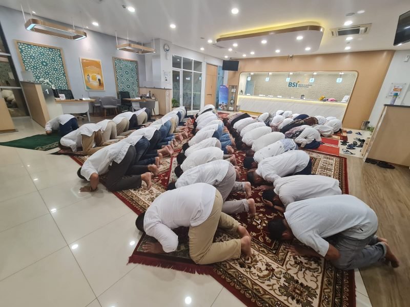 Banda Aceh – Regional CEO BSI Aceh, Wisnu Sunandar, bersama dengan pegawai BSI di seluruh Aceh melakukan sujud syukur serentak pada akhir tahun 2023, Jumat 29 Desember 2023.