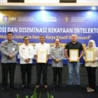 Banda Aceh – Kepala Kantor Wilayah Kementerian Hukum Aceh, Meurah Budiman, menyerahkan sertifikat merek kepada pelaku…