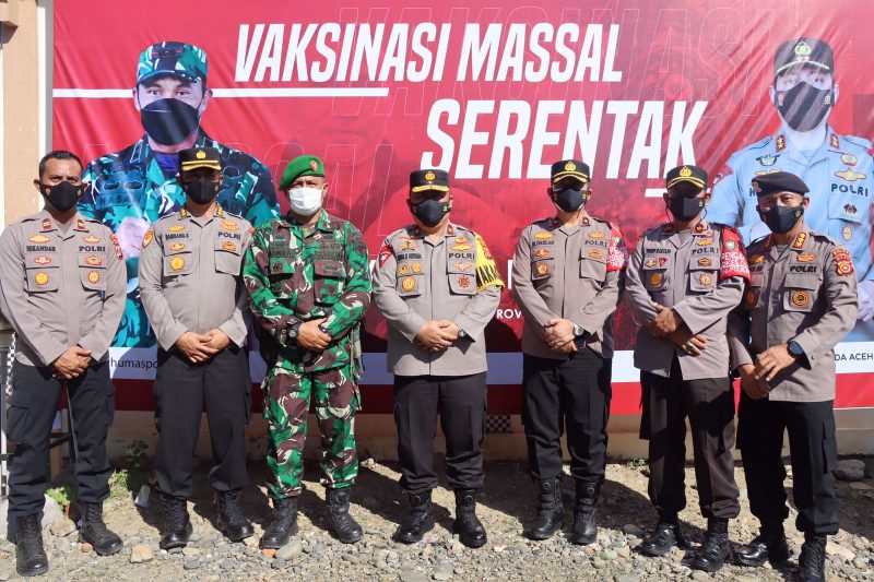 NOA | Aceh Besar – Tiga Pejabat Utama (PJU) Polda Aceh masing-masing Karo Rena, Dirintelkam dan Dirpamobvit Polda Aceh mendampingi Wakapolda Aceh Brgjen Pol. Dr. Drs. H. Agus Kurniady Sutisna, M. M., M. H, saat meninjau dan menyambangi lokasi vaksinasi massal di Aula Kantor Camat Lhoong, Aceh Besar, Jum’at (24/12/21).