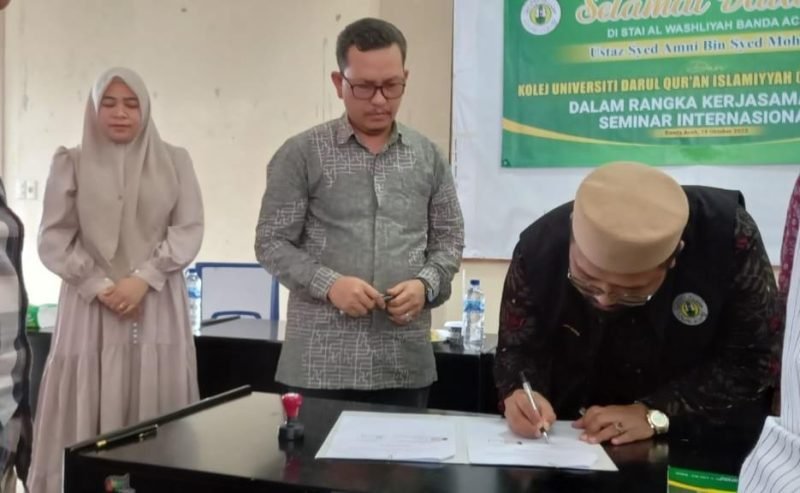 Banda Aceh – Tiga Sekolah Tinggi Al Washliyah Banda Aceh yaitu Sekolah Tinggi Ilmu Sosial dan Ilmu Politik (STISIP), Sekolah Tinggi Keguruan dan Ilmu Pendidikan (STKIP) dan Sekolah Tinggi Agama Islam (STAI) melakukan penandatanganan perjanjian kerjasama Internasional dengan Kolej Universiti Darul Qur’an Islamiyyah (KUDQI) Malaysia yang berlangsung di Aula Perpustakaan Lantai 2 (Dua), Kampus Al Washliyah Banda Aceh, Kamis (19/10/23).