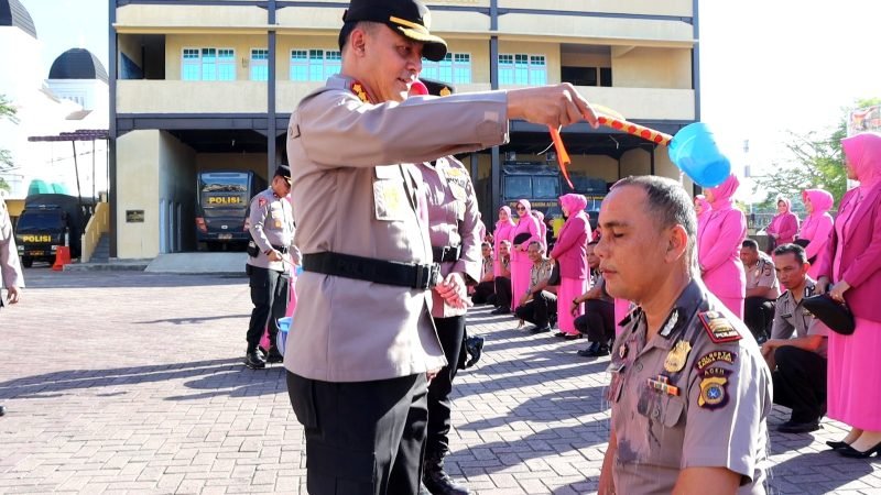 Banda Aceh – Prosesi tradisi mandi bunga atau mandi kembang, dilakukan oleh para pucuk pimpinan di Polresta Banda Aceh saat 63 personelnya mengalami kenaikan pangkat setingkat lebih tinggi, Senin (3 /7/2023).