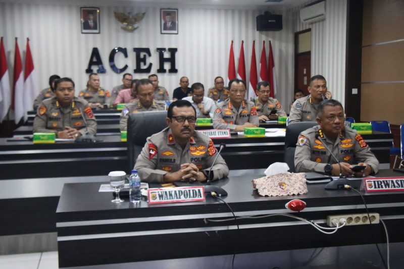 NOA | Banda Aceh – Wakapolda Aceh Brigjen Syamsul Bahri menghadiri rapat yang dipimpin Wakapolri Komjen Gatot Eddy Pramono secara virtual di ruang vidcon Mapolda Aceh, Selasa, 13 Juni 2023.