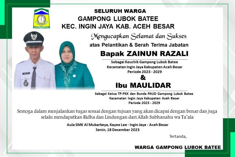 Setelah dilantik, seluruh warga gampong Lubok Batee, Kecamatan Ingin Jaya, Kabupaten Aceh Besar mengucapkan selamat dan sukses atas pelantikan dan serahterima jabatan tersebut.